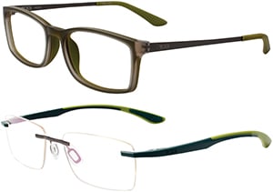 The Tumi LITE collection ranges from three-piece, rimless frames with stainless steel bridges and bold-colored TR90 double-injection temples, to sleek frames with TR90 co-injected rubber fronts paired with stainless steel temples. Colors include black/gray, brown, gray, olive, smoke, and tortoise.