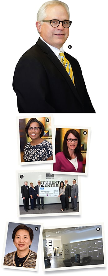 1. Tom Breen, Williams Group; 2. Sherianne James, Transitions Optical, Inc.; 3. Patience Cook, Transitions Optical, Inc.; 4. Celebrating the MBKU’s newly named student center are (l-r) MBKU’s Kevin L. Alexander, O.D., Ph.D. and Julie A. Schornack, O.D., M.Ed.; Essilor’s Bob Colucci; MBKU student president Tiffany Chen; Essilor’s Rod Tahran, O.D.; and Stanley Woo, O.D., MS, MBA, of Southern California College of Optometry; 5. Agnes Wong, M.D., Ph.D., FRCSC.; 6. Safilo’s new showroom in Budapest
