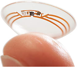 The futuristic, new contact lens, which was announced in prototype form on the Google blog a few weeks ago, employs a tiny wireless chip that houses a glucose sensor and an antenna thinner than a strand of hair; the device is embedded between two layers of soft contact lens material. This smart lens, which is powered by tapping into radio waves in the air, is designed to send the tracking data to a smartphone or other device. “We’re testing prototypes that can generate a reading once per second,” Google says on its blog. “We’re also investigating the potential for this to serve as an early warning for the wearer, so we’re exploring integrating tiny LED lights that could light up to indicate that glucose levels have crossed above or below certain thresholds.”
