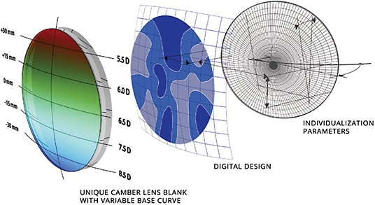 Camber Technology utilizes a special, new lens blank with a variable base curve, which means the front surface increases in optical power from the top to the bottom of the lens blank. This provides the appropriate base curve from the distance zone to the near zone.