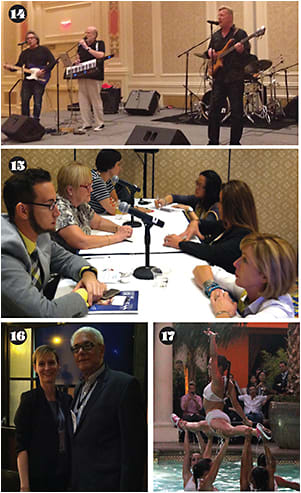 14. Visionary, a band comprised of eyecare industry professionals, performed a benefit concert in honor of the late Darryl Meister, Zeiss staffer and industry mentor; 15. Meeting with attendees after their “Visual Merchandising and Retail Secrets” panel discussion, moderated by Eyecare Business’ Steph De Long, are (l to r) Travis Reed, Carol Norbeck, and Julia Gogosha; 16. Adlens’ Mike Ferrara and Mara Nieuwsma pose following a press event celebrating the rollout of Adlens’ latest adjustable eyewear; 17. The Aqualillies put on a synchronized swimming performance in their Converse sneakers to celebrate the launch of Converse Custom at Tao Beach with REM Eyewear