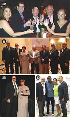 10. Dominique Jara (l) and Tina Lahti (r) of Vision-Ease Lens flank (l to r) United Healthcare’s Marc Van Camp, Gregory Hibbard, and Michael Keating at a reception hosted by Spectera and Vision-Ease; 11. (l to r) Larry Clarke, John Fried, Virginia “Susie” Lesher, Michael B. Brown, Jerry Mansuy, Matt Iovaldi, and Jim Roussel are honored at The Vision Council Optical Lab Division’s Hall of Fame Awards Banquet (missing are Mike Dougher and Frank Giammanco); 12. Ed Greene, recently retired from The Vision Council, accepts The Optical Lab Division’s Director’s Choice Award from Virginia “Susie” Lesher; 13. Henry (l) and James Shyer flank music producer Randy Jackson at Zyloware’s booth and meet customers;