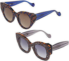 Fanny, a cat-eye, and Sylvy, a square shape, are sunglasses created in two color variations in 8mm acetate that enables play between all the material layers while getting a special translucent effect and depth.
