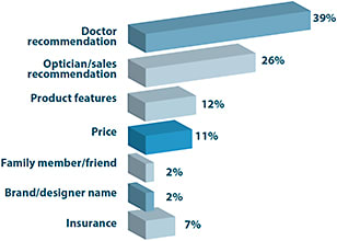 This thought is even more potent when you consider that only 11% of ECPs say price is the most important influence on consumer purchasing today. In fact, eyecare professionals say that doctor recommendation (39%) is the number-one factor influencing consumer purchases. Other factors influencing consumer purchases include optician/salesperson recommendation (26%), product features (12%), and insurance (7%).