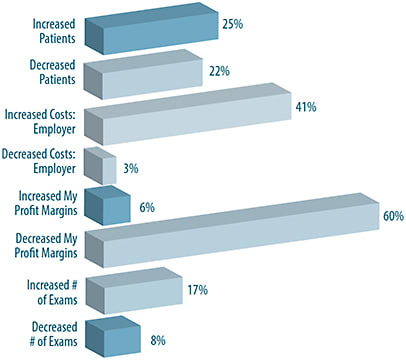 How has healthcare reform affected eyecare professionals? A full 61% say it has decreased their profit margins and 41% say it has increased their costs. At the same time, some experts say that success has been realized with the inclusion of children’s wellness eye exams in most medical plans (though some say that the services provided under these plans are low margin).