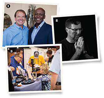 1. Vision Source executives Jim Greenwood, left, and Derrick Artis; 2. Mark Kapperman, O.D., a Vision Source member, participating in Robert X. Fogarty’s “Dear World” photography project; 3. A glimpse of the action on the exhibit floor