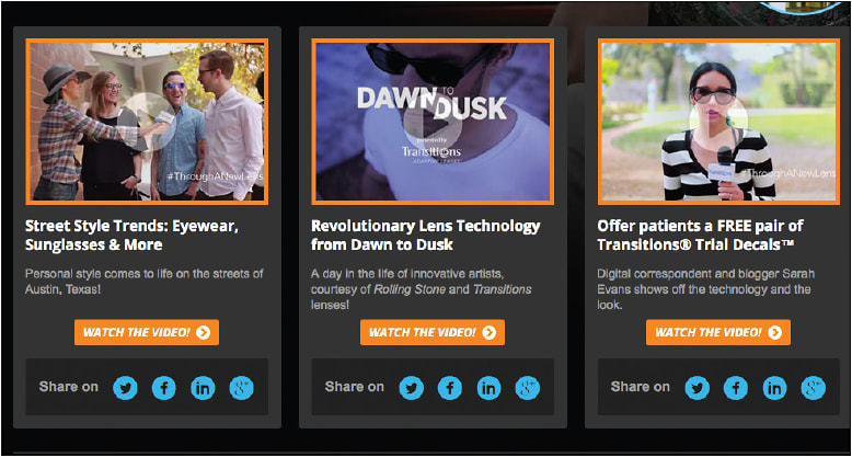 The socially shareable videos feature fashion tips and trends from style maven and eyeglass guru Sarah Evans at South by Southwest (SXSW); content from Rolling Stone’s “Dawn to Dusk” editorial series sponsored by Transitions adaptive lenses; and a way to showcase the Transitions trial decals. Simple share buttons make it possible for eyecare professionals to share an item directly with their patients on their Twitter, Facebook, LinkedIn, or Google+ accounts. ECPs are invited to spark interest with their patients over social media by sharing the videos using the hashtag #ThroughANewLens.