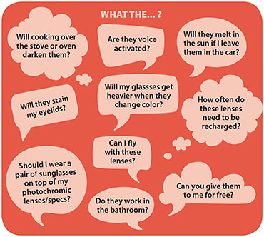 Transitions Optical, Inc., surveyed nearly 300 ECPs about some of the more amazing questions they’ve heard regarding photochromics. We’ve collected some of the best ones here.