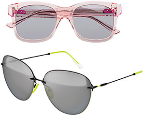 With two commercial styles, the Color Feeling grouping reinterprets classic shapes in light, transparent acetate with neon pops on the collection-specific hinges.