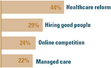 Since 2013, healthcare reform has topped the list of business challenges. While that hasn’t changed, the number-two challenge definitely has. In fact, for the first time in six years, hiring good people surpassed managed care on the list of business challenges you’re facing. That is fueled in no small degree by the fact that unemployment in the U.S. is at its lowest level since April 2008.