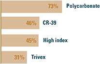 ECPs report that well over half their customers and patients (66% in all) now request specific lens brands. When asked about near-term potential, ECPs put three lens technologies—computer vision/blue light, wavefront, and sunwear—onto their Top 10 List. In terms of materials, polycarbonate is cited by nearly 73% of ECPs as their top-selling lens material, with CR-39 and high index almost tied for the number-two spot.