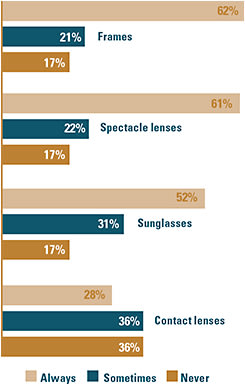 They are also discussing brand names when it comes to frames. While O.D.s are most likely to discuss contact lens brands, opticians report that they discuss frame and spectacle lens brands with their customers. All told, 13% of O.D.s surveyed say they always address frame brands in the chair, while 62% of opticians report that they always discuss them with customers.