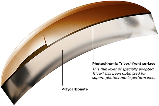 Younger Optics and Transitions Optical developed a polycarbonate composite lens that incorporates a thin photochromic, front-surface bifocal layer made of Trivex—resulting in a photochromic bifocal that is surfaced, polished, edged, and dispensed just like a clear polycarbonate lens.
