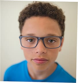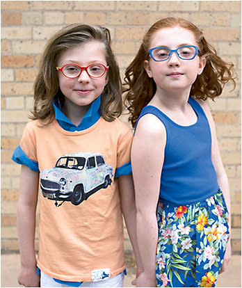 On Kaizer, Chick Occhiali Italia Chick K503 from Prisme Optical in highly bendable rubber in handpainted red/orange with a patented hinge. On Zada, Ogi Kids OK323 bright blue cat-eye style with metal front and acetate temples. Photo by Chowen Photography. Fitting optician: Tracy Henderson, Eye.D.