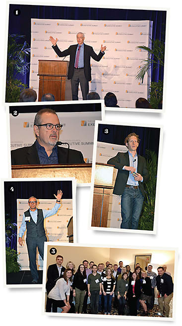 1. “Good to Great” author Jim Collins delivers a wealth of knowledge and ideas to the Executive Summit audience; 2. Mike Daley, CEO of The Vision Council, greets the crowd of attendees; 3. Jonah Berger, Ph.D., author of “Contagious,” shares specifics on why concepts and products catch on today; 4. Mike Hundert, CEO of REM Eyewear, vice chairman of The Vision Council, and the new Chair of TVC’s Show Committee, was the Summit’s Master of Ceremonies; 5. The Young Optical Leaders Organization (YOLO) gathers for the first time at the Summit
