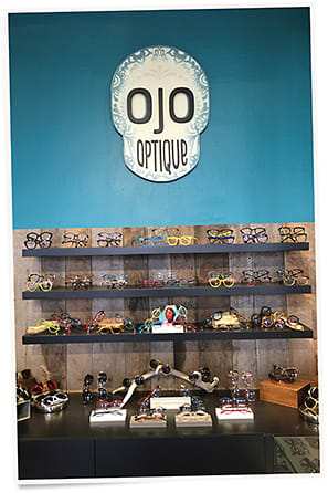 An eyewear display at Ojo Optique speaks to its Santa Fe location