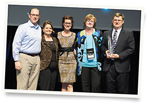 At the Transitions Innovations Awards ceremony: (l-r) Matt Smith from Sutherlin Optical Lab, and VisionArts staff Gayle Bergthold, Christine Foster, Cindy Vann, and James Vann, O.D.
