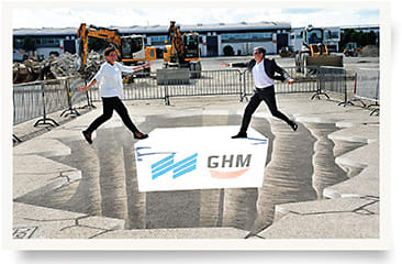 Bettina Reiter, project manager of opti, and Dieter Dohr, CEO of GHM, enjoy 3D street art celebrating the construction of the two new halls (C5 und C6) at Fairground Messe München. opti will benefit from the extension of the Fairground Messe München as of 2019.