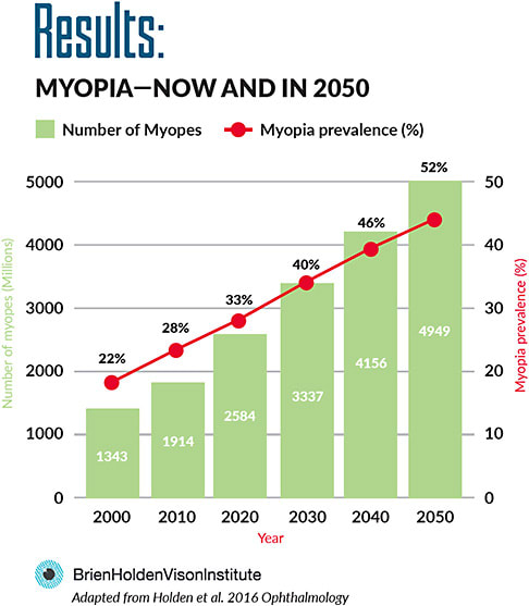 In the U.S., the percentage of myopes among us has just about doubled over the past few decades, with some predictions of 50% of the population suffering from myopia within the next few years. The World Health Organization has forecast that at the current rate of progression, 2.5 billion people globally will be myopic by 2020, and half of the globe will be myopic by 2050.
