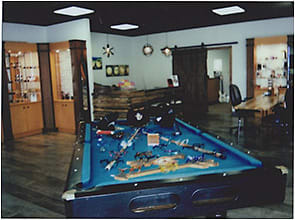- Custom-made art + features, including reclaimed wood bar built by Dr. Williams