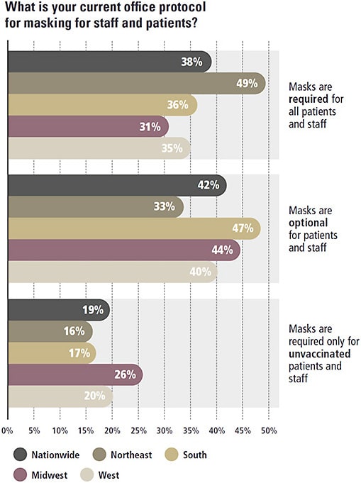 ➤ Masking. The biggest change relates to masking measures. Today, just 38% of respondents say that masks are required for all patients and staff—a notable drop from 60% in 2021. The Northeast presented as the U.S. census region where the most ECPs (49%) require in-office masking, while the Midwest Region had the least (31%). Nationwide, 42% of ECPs said that masks are optional in their offices, while 19% say they are required only for unvaccinated patients and staff.