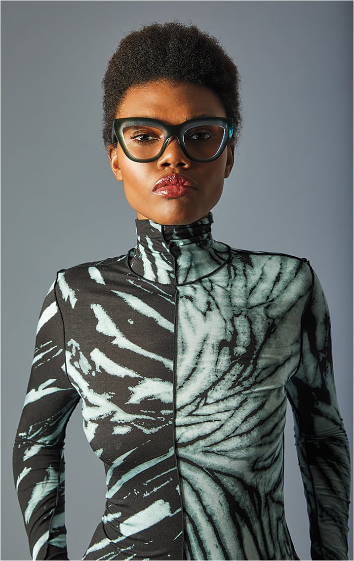 The Blake Kuwahara Hall optical style is a stunning take on the cat-eye silhouette in the brand’s forest hue, a luscious green-to-silver-sparkle gradient.