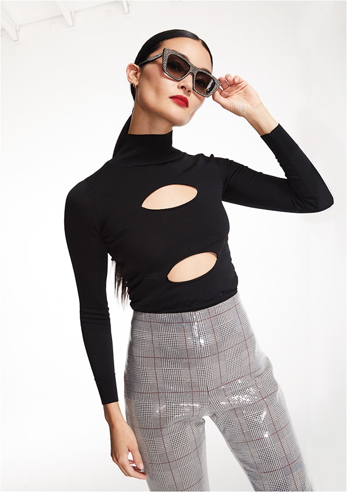 The Celine CL4187IS from Thélios heralds a redux of glitz with a crystal embellished black acetate cat-eye frame with gradient lenses.