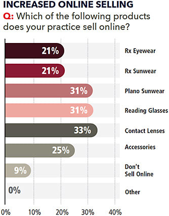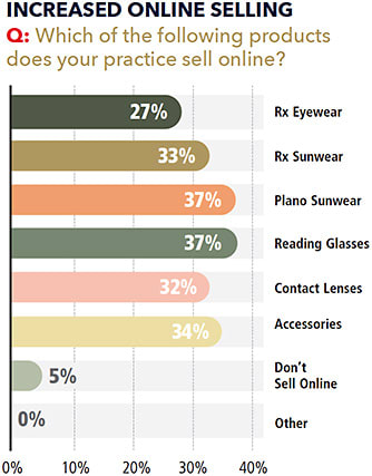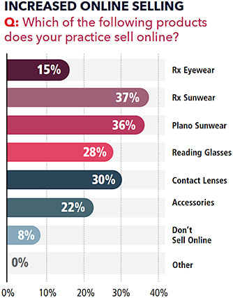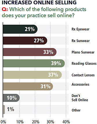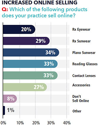 - Online Selling. Interestingly, ECPs have been moving into online offerings in the past years—our 2023 study revealed that 34% sell plano sunwear online, 33% sell contact lenses, 33% sell readers, 27% include accessories in their online offer, 29% include Rx sunwear, and 20% serve up the Rx eyewear option online.Asked, “If you don’t sell online now, do you expect to be in the next two years?”, 87% of ECPs surveyed say yes. That’s up from 84% in 2022.