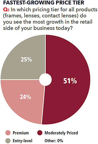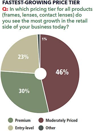 The greatest potential for sales is reported by area ECPs as contact lenses and accessories. That’s different than the West, for example, where contact lenses took fourth place. As for price points, moderately priced product is selling twice as well in the Midwest as either premium or entry level frames, lenses, and contact lenses.