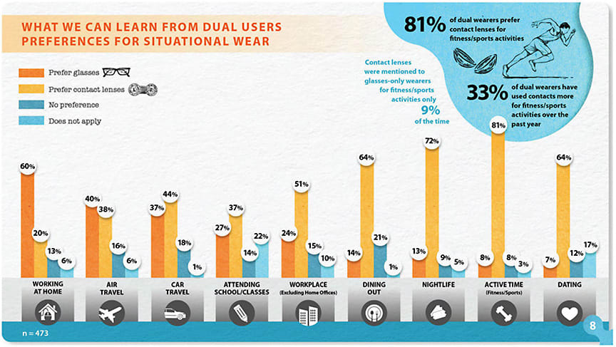 This is the assertion CLI makes clear through 18 pages of data, beginning with the proof that patients interested in dual wear overwhelmingly exist—and evenly on both sides—with about 1 in 5 glasses-only wearers interested in contact lenses and vice versa. Of the respondents, 8 in 10 agreed that having choice is “a powerful benefit” for reasons including feeling their best in different situations, considering how their eyes feel, or simply wanting to choose their style.