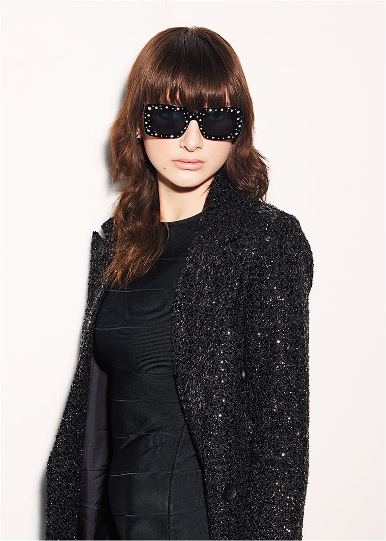 The Carolina Herrera HER 0131/S from Safilo is an oversized acetate rectangle with bold Swarovski crystal accents.