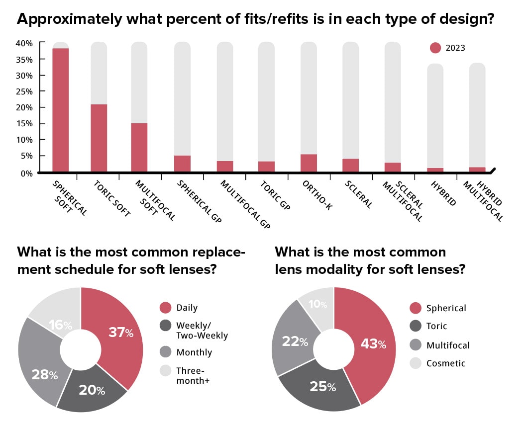 • SOFT LENSES. Lots of variety here, with ECPs reporting that just over one-third of their soft lens prescriptions were dailies, while just under 30% were one-month replacement lenses.