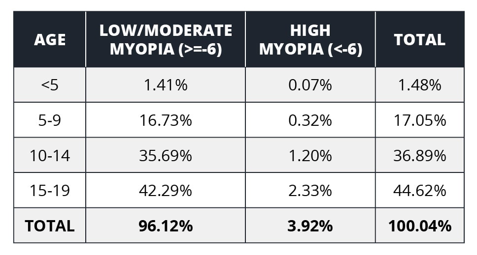 As children progress into the 5-to-9 age group, there’s a substantial increase in myopia prevalence. Here, the numbers jump to accounting for 16.73% of all childhood myopia in the low/moderate myopia group and 0.32% in the 5-to-9 high myopia group. This sharp rise suggests that myopia begins to manifest and progress significantly during these formative years, likely influenced by factors such as increased near-work activities and reduced time spent outdoors.