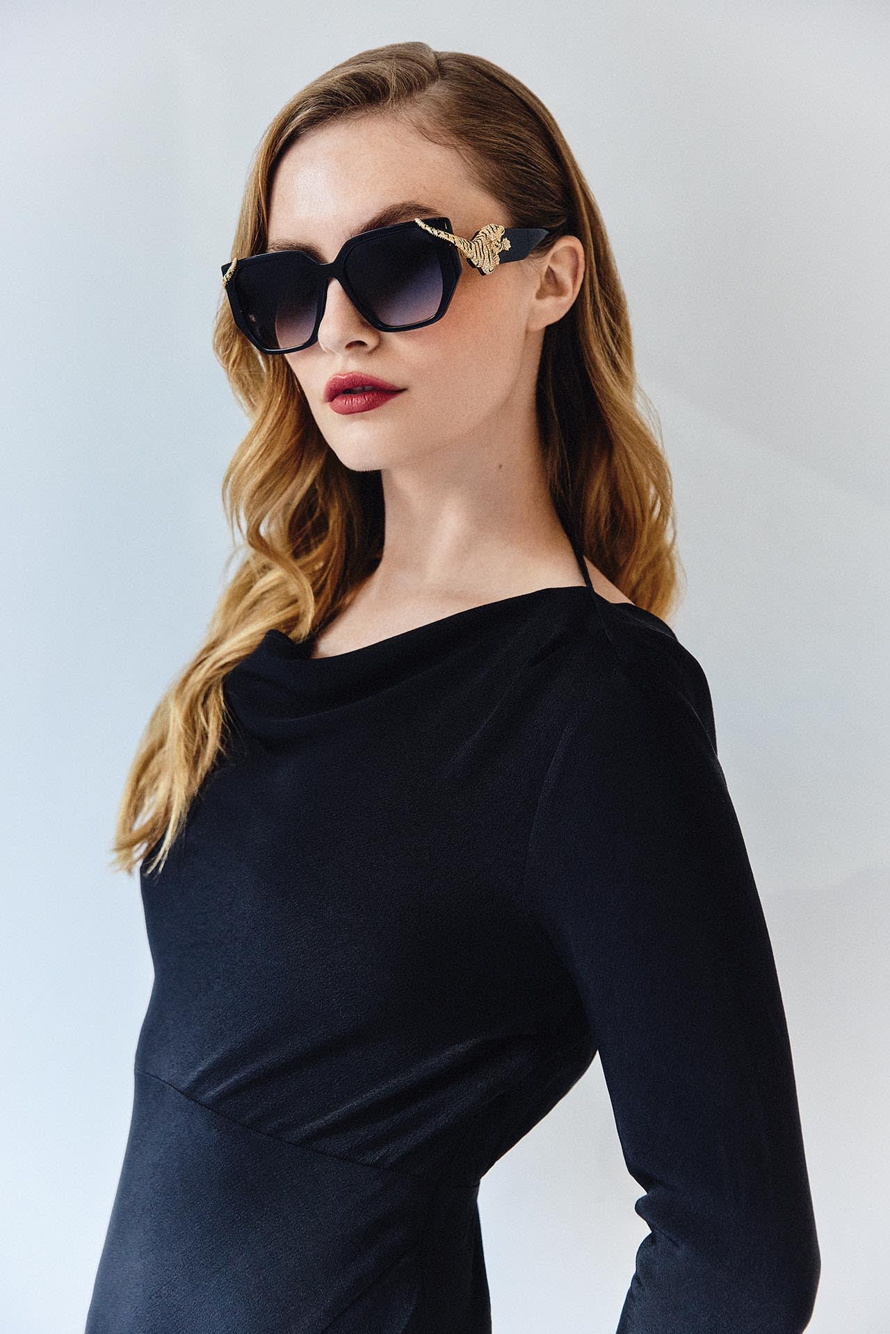 The Roberto Cavalli SRC098S from De Rigo, inspired by the brand’s iconic Roar bag, features crystal-encrusted golden metal tiger embellishments on the temples.