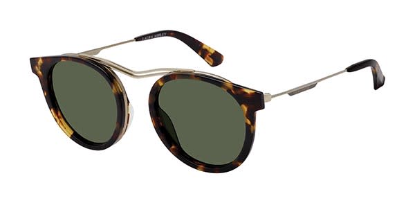 The Carolina Herrera 0318, pictured here, is an acetate butterfly sun style adorned with white pearls and a gold metal sphere on the temples. The CH monogram is engraved on the metal element, and half-pearl details accent the end-tips.