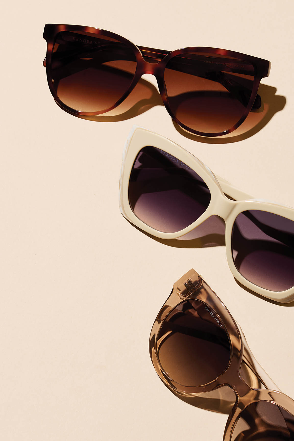 Pictured here from the top, the Kendra Scott KE604S, KE611S, and KE610S are acetate sun styles with modern twists on classic silhouettes, each incorporating the brand’s iconic Dira logo.