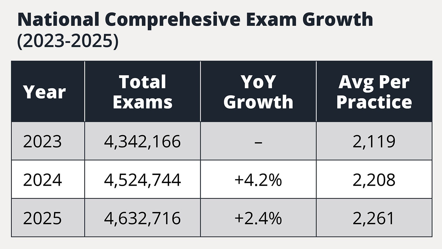 • Average exams per practice rose from 2,119 (2023) to 2,261 (2025), but per-practice growth is flattening too.
