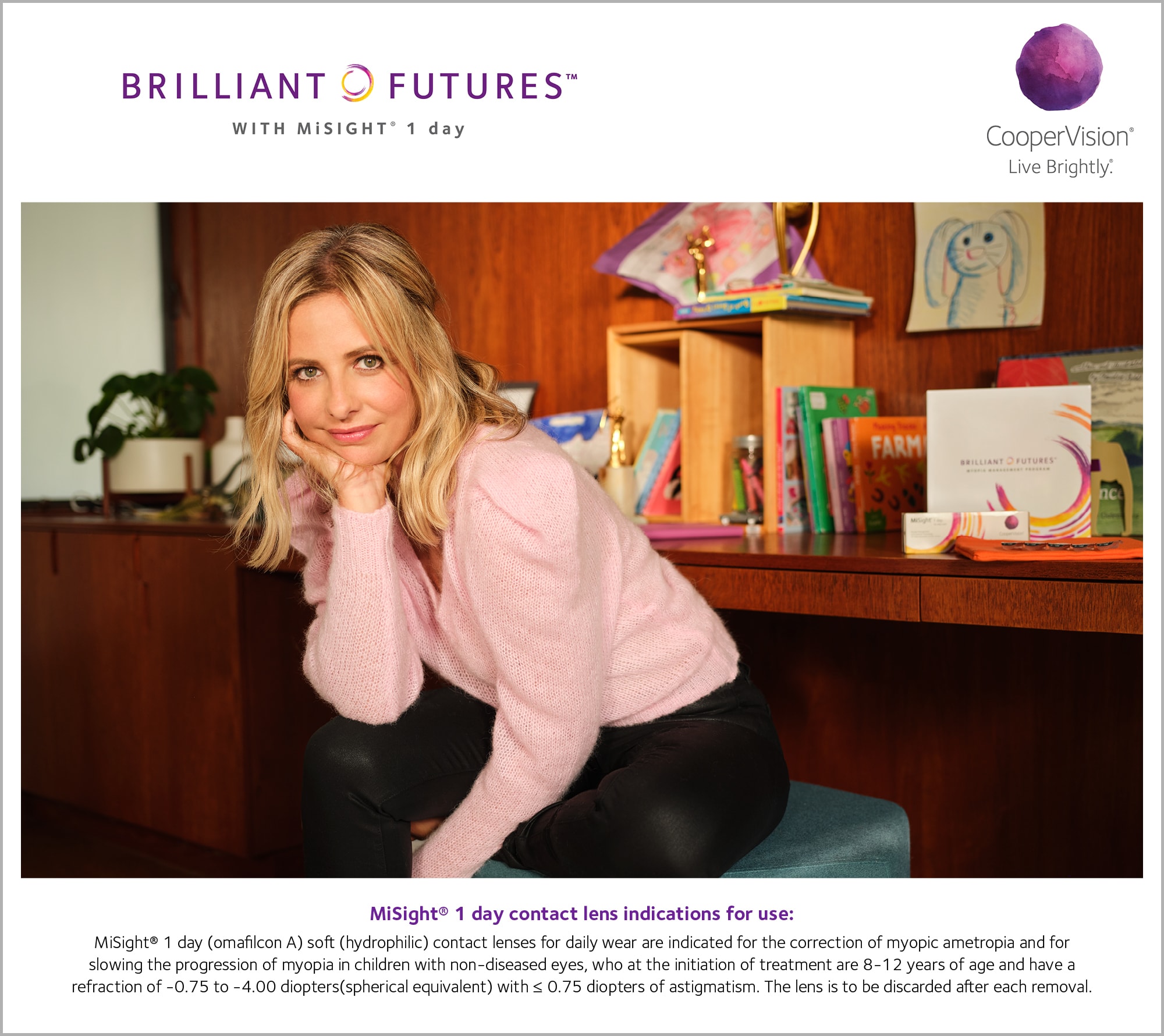 September 3, 2020—CooperVision, a global leader in myopia management, today announced popular U.S. television actress, producer, and entrepreneur Sarah Michelle Gellar as the spokesperson for its Brilliant Futures™ Myopia Management Program. Brilliant Futures is built around MiSight® 1 day, the first and only soft contact lens FDA-approved to slow the progression of myopia in children ages 8-12 at the initiation of treatment.