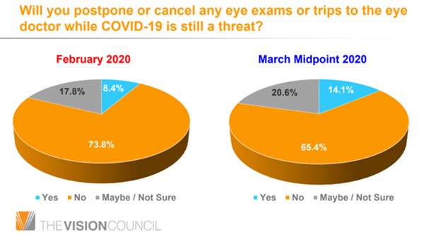 Conducted by TVC as part of its monthly VisionWatch reports, the Midpoint March survey builds upon a study launched in February to measure consumers’ level of concern over exposure to COVID-19 and tracks trends in consumer behavior relating to eye exams and intended eyewear purchases.