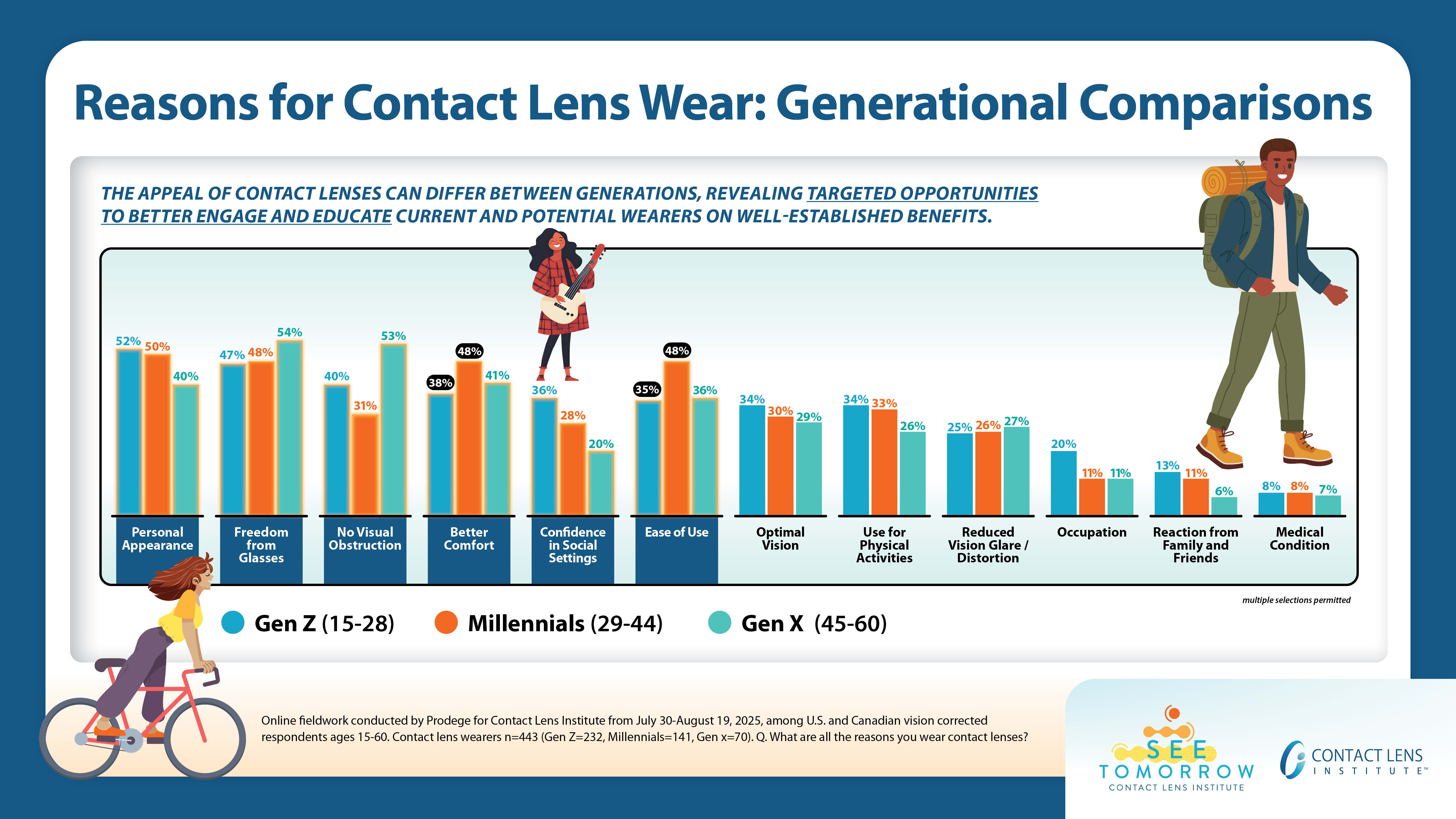 The study surveyed 1,308 vision-corrected respondents in the U.S. and Canada across three generations—Generation Z (ages 15-28), millennials (ages 29-44), and Generation X (ages 45-60). Results indicate that while appearance and freedom from glasses are common reasons for contact lens wear across all age groups, the relative importance of comfort, convenience, and technology differs by generation.