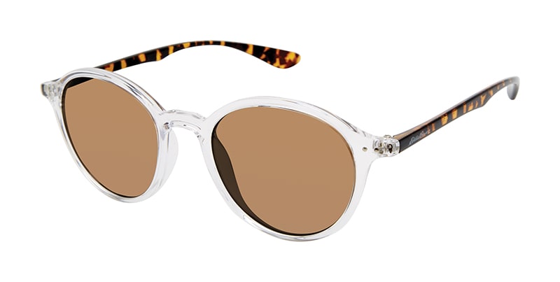 Pictured here, the Newport features a retro-inspired round silhouette with metal rivets—available in blue, clear, and tortoise.