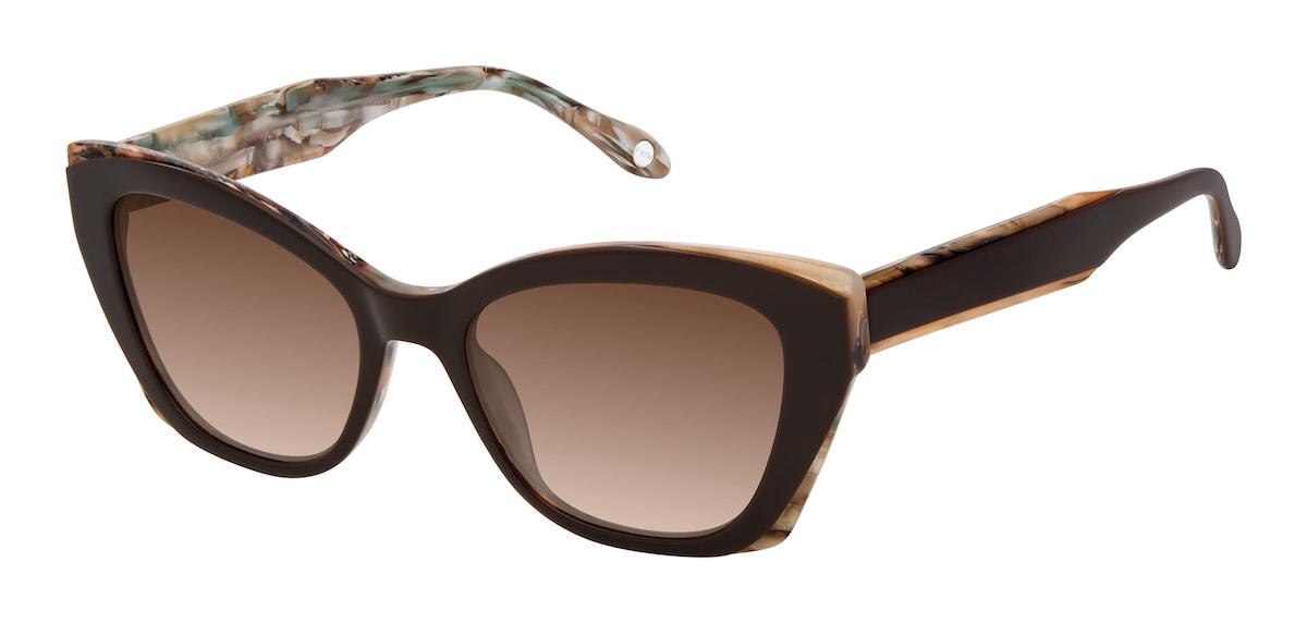 The F2134, pictured above, flaunts that peekaboo effect, as the upper layer is sculpted to reveal a contrasting color beneath. The cat-eye frame is available in black ivory, chocolate taupe pearl, and multi-bloom emerald.