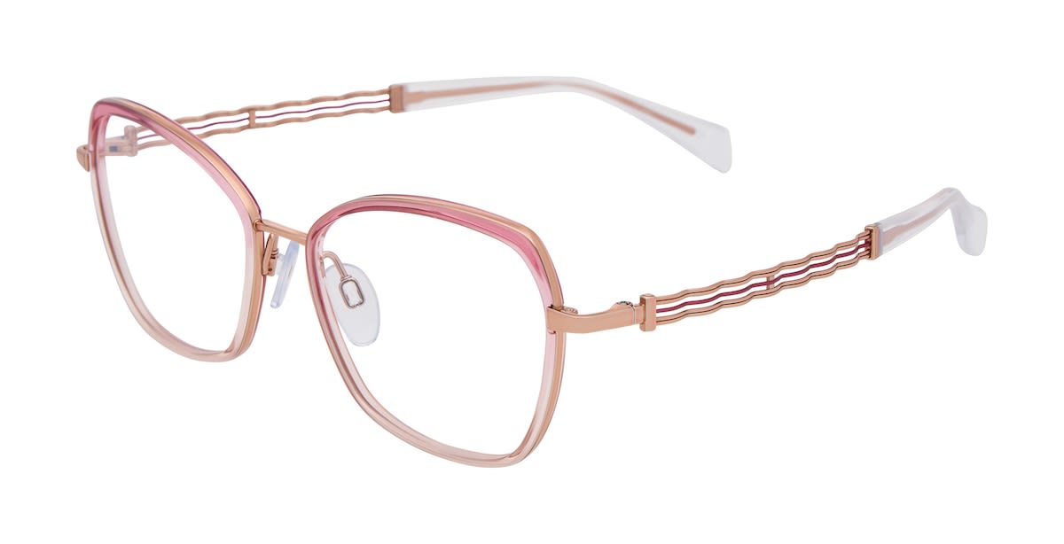 The XL2191 features a geometric cat-eye shape, acetate rims that incorporate gradient color treatments along the interior, and the signature wavy “Excellence Titan” temple wires. A central temple line reflects the frame’s front color—available in beige, gray, and pink.