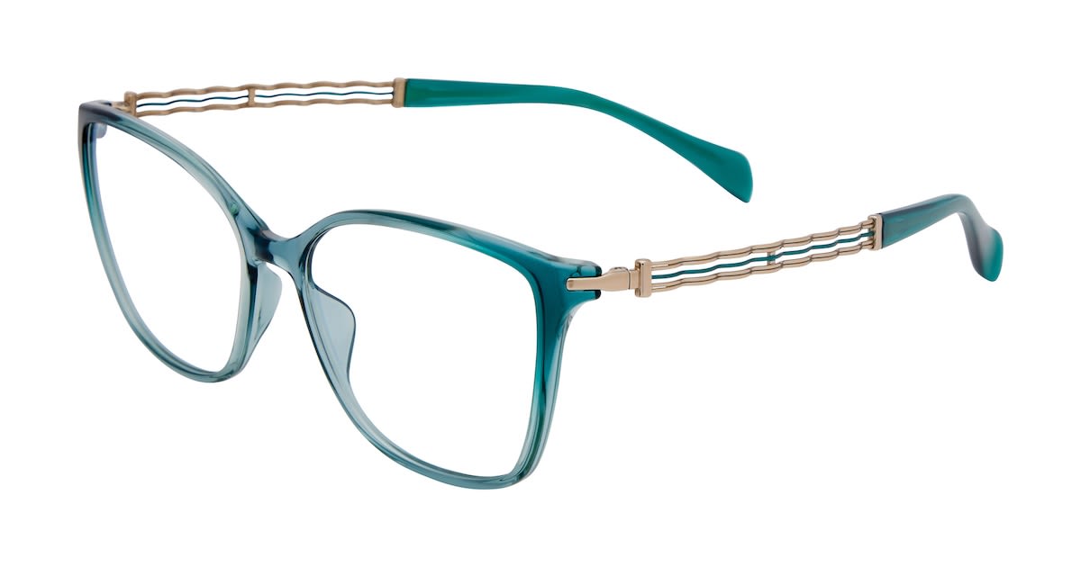 The XL2190, pictured above, is a fox-shaped combination frame crafted from TR90 and titanium. The temples feature wavy “Excellence Titan” wires, a signature element of the Etude collection. Color detailing includes a central temple wire that aligns with the tones of the rim and end tips, while gradient accents are applied to the front corners—available in blue, green, and rose.