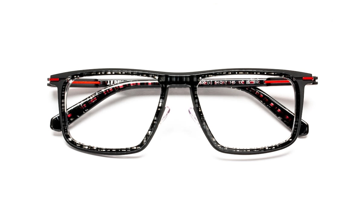 The JF3123, pictured above, is a bold rectangular silhouette crafted with patterned, translucent acetate.
