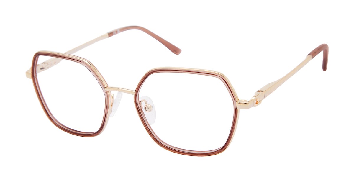 The TYATP8360 is an acetate-metal combination optical frame featuring a geometric silhouette—available in rose gold, mocha/light gold, and chambray/light gold.