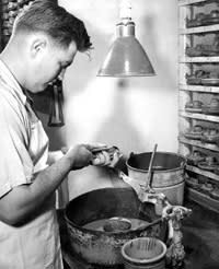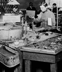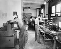 Craftsmen hard at work at Sutherlin Optical's Kansas City lab in the 1950s, a far cry from today's high-tech optical