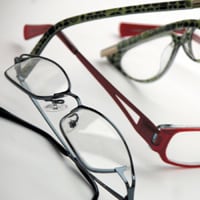 NEOSTYLE Models: EOS 08 (top), EOS 12 Material: German silver/acetate Sizes: 53/17-135 (EOS 8), 50/16-140 (EOS 12) Colors: Violet/black, mauve (EOS 8); copper, black/ silver (EOS 12) Market: Unisex Price: $145 Phone: 800-854-2782 |