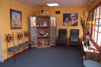 Wedding Niki's talents as a graphic designer to husband Robert's opticianry experience, the couple has created an open, welcoming practice with plenty of light, warm colors, and furniture in wrought iron and wood. That's furniture, not displays. In place of traditional optical frame displays, the Pinos purchased and renovated four armoires for storage and displays. They also purchased four wrought iron baker's racks and put in glass shelving to display eyewear. A bookstand has been arranged in two pieces for additional display.