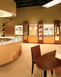 A rounded reception desk and inviting product displays help create a space that is both comfortable and efficient |